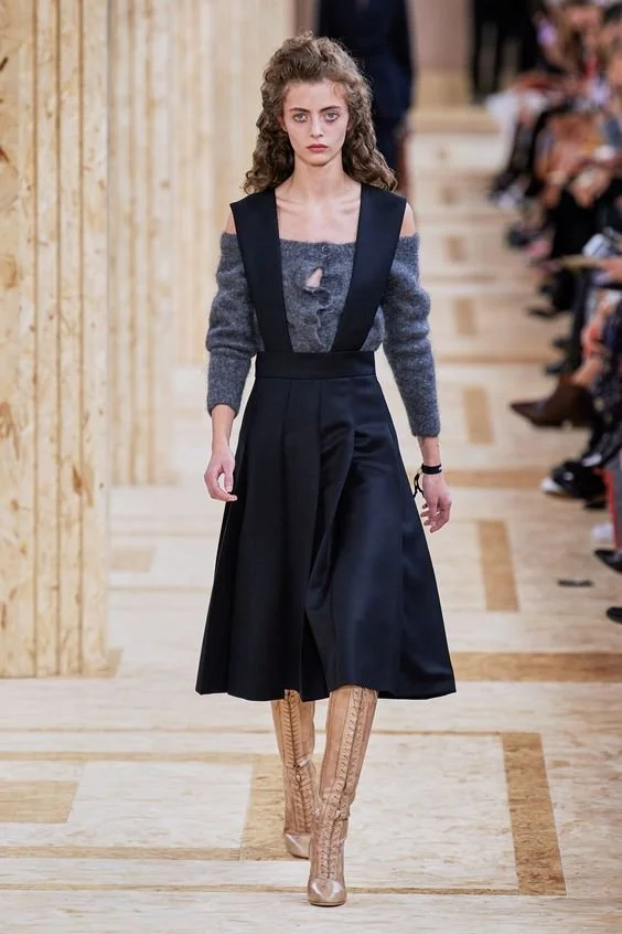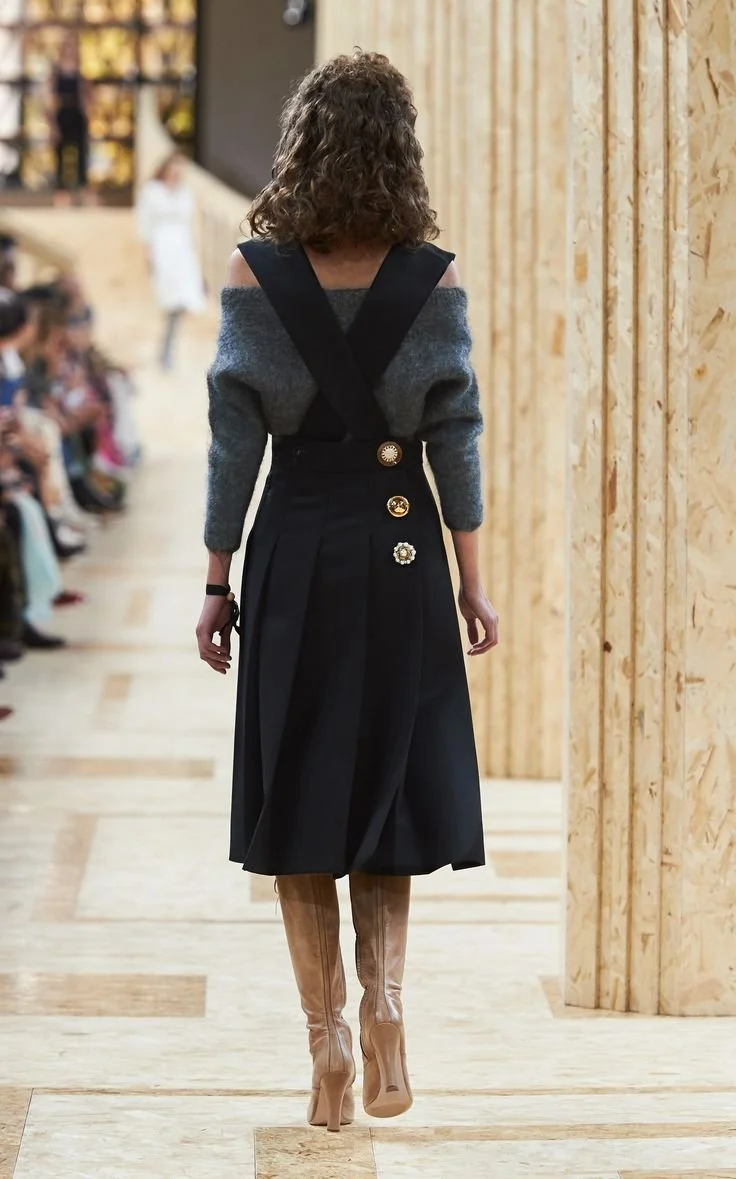 This runway recreation was inspired by the Racerback Pleated Wool Dress from Miu Miu’s Spring 2020 Ready-to-Wear collection. I added tiered pleats to the skirt . The bodice sleeves are strapped and gathered. The collar is pleated.